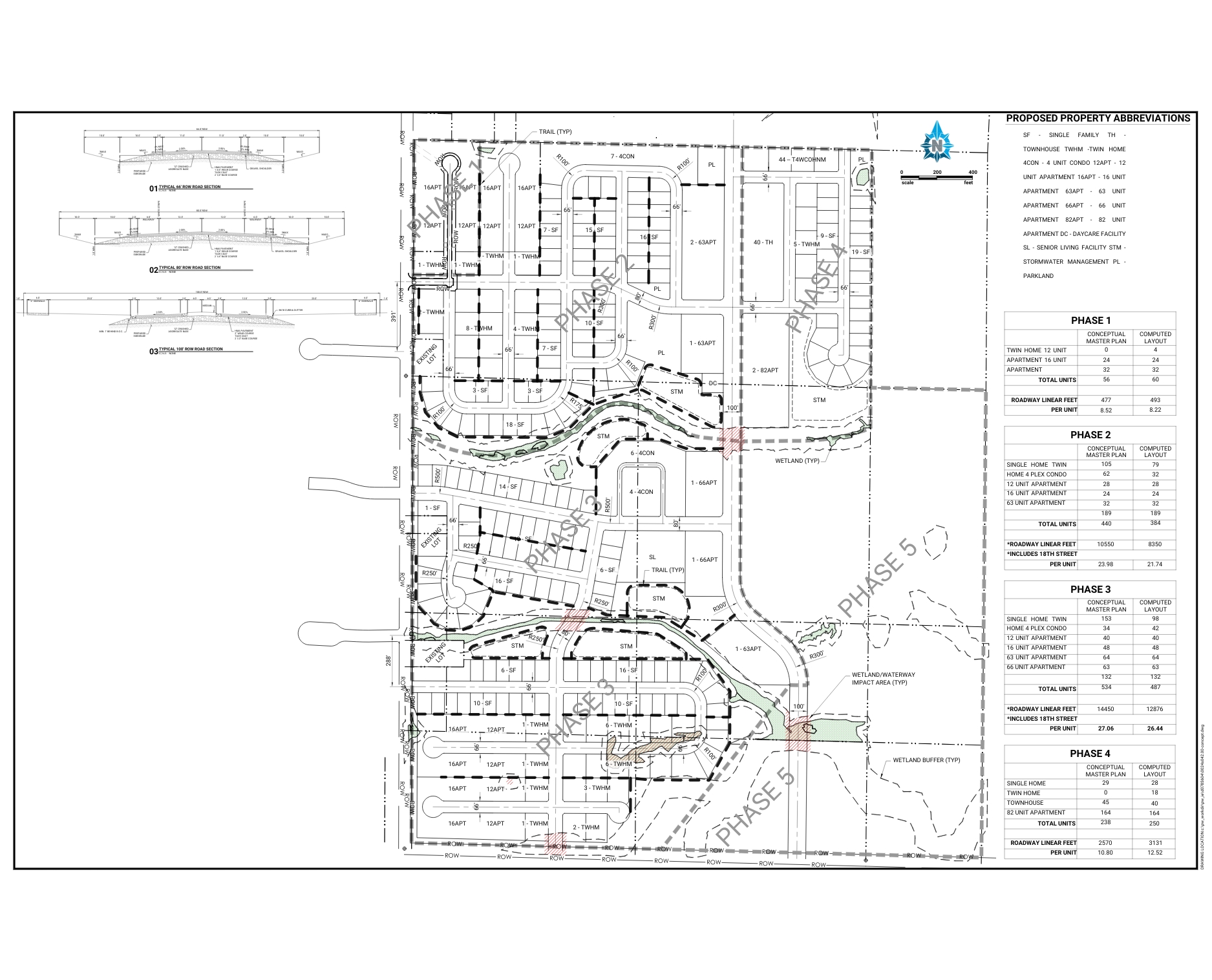 Using this foundation, the team explored conceptual street and block patterns, utility corridors, drainage strategies, and park spaces that balanced functionality, placemaking, and infrastructure efficiency. Future land uses were applied to the conceptual layouts to develop a master development matrix and a logical phasing strategy. We then advanced the vision through proposed land divisions, public infrastructure design, permit applications, and bid documents, creating a clear pathway from planning to construction.